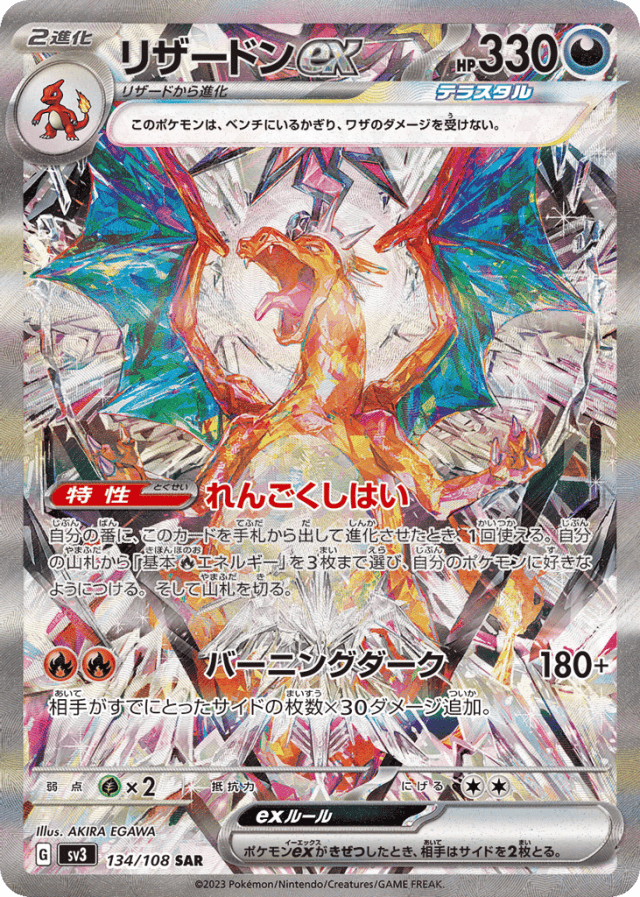 自分の番に、このカードを手札から出して進化させたとき、1回使える。自分の山札から「基本Fireエネルギー」を3枚まで選び、自分のポケモンに好きなようにつける。そして山札を切る。