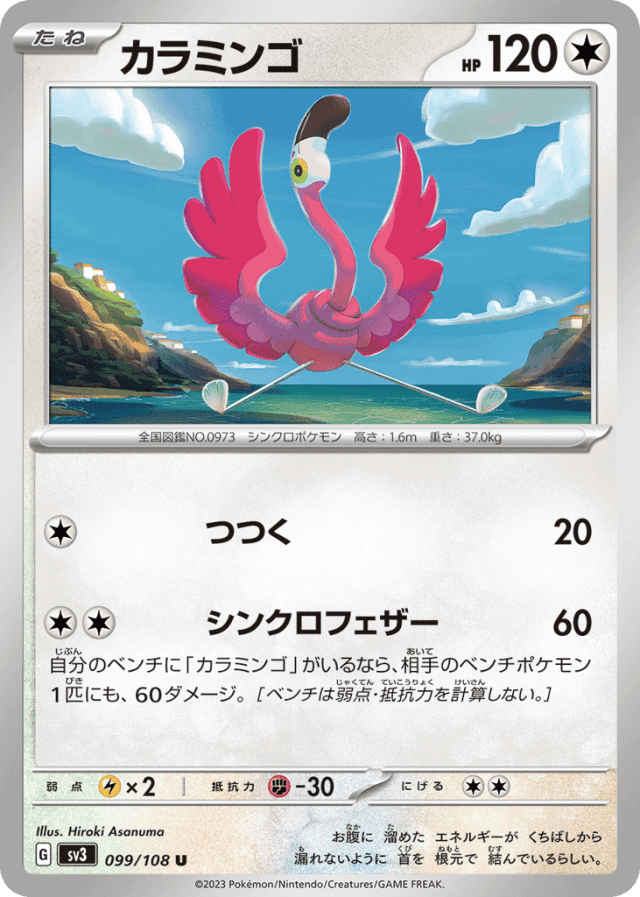 自分のベンチに「カラミンゴ」がいるなら、相手のベンチポケモン1匹にも、60ダメージ。[ベンチは弱点・抵抗力を計算しない。]