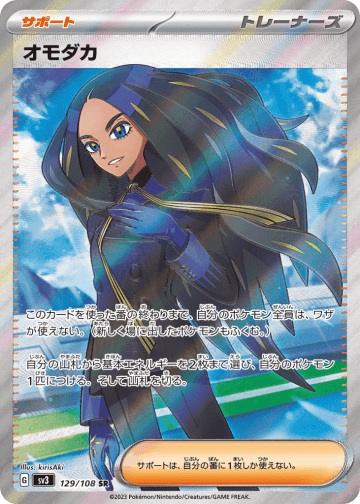 このカードを使った番の終わりまで、自分のポケモン全員は、ワザが使えない。(新しく場に出したポケモンもふくむ。) 自分の山札から基本エネルギーを2枚まで選び、自分のポケモン1匹につける。そして山札を切る。 サポートは、自分の番に1枚しか使えない。