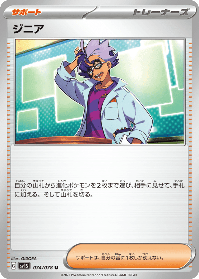 自分の山札から進化ポケモンを2枚まで選び、相手に見せて、手札に加える。そして山札を切る。 サポートは、自分の番に1枚しか使えない。