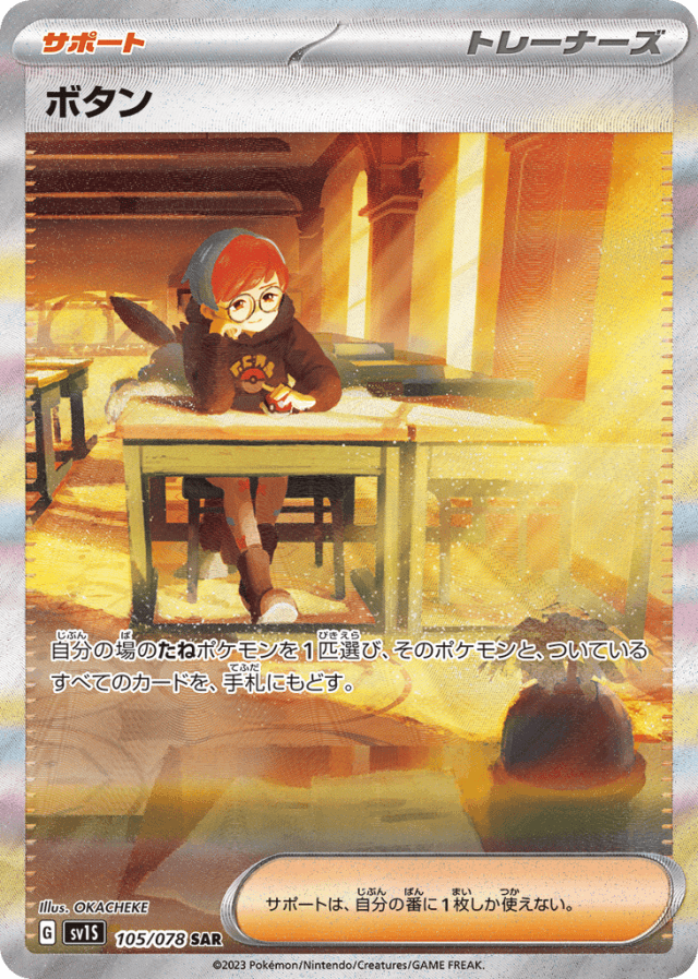 自分の場のたねポケモンを1匹選び、そのポケモンと、ついているすべてのカードを、手札にもどす。 サポートは、自分の番に1枚しか使えない。