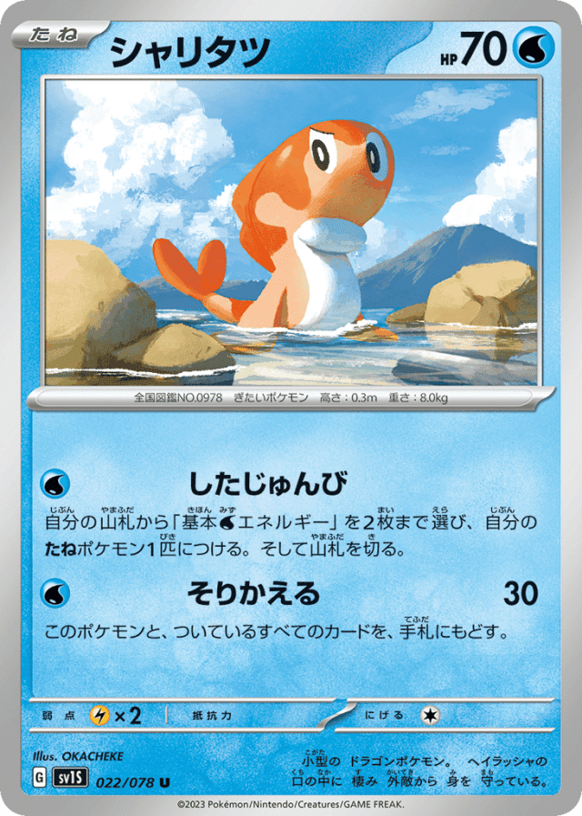 自分の山札から「基本Waterエネルギー」を2枚まで選び、自分のたねポケモン1匹につける。そして山札を切る。