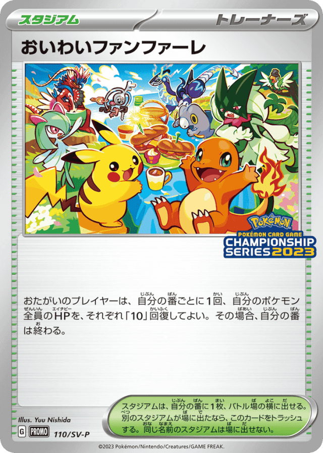 おたがいのプレイヤーは、自分の番ごとに1回、自分のポケモン全員のHPを、それぞれ「10」回復してよい。その場合、自分の番は終わる。 スタジアムは、自分の番に1枚だけ、バトル場の横に出せる。別の名前のスタジアムが場に出たなら、このカードをトラッシュする。