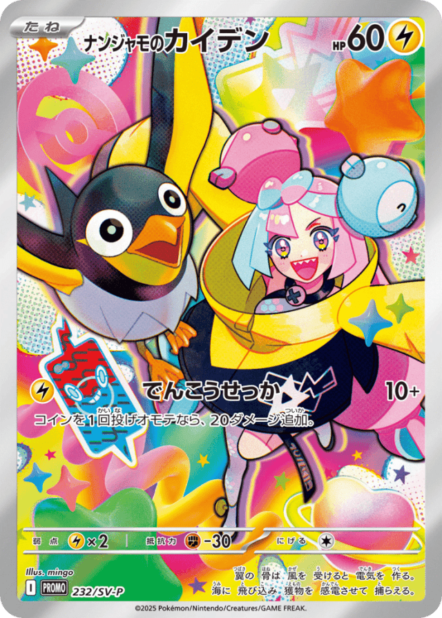 翼の 骨は 風を 受けると 電気を 作る。 海に 飛び込み 獲物を 感電させて 捕らえる。 (When its wings catch the wind, the bones within produce electricity. This Pokémon dives into the ocean, catching prey by electrocuting them.)