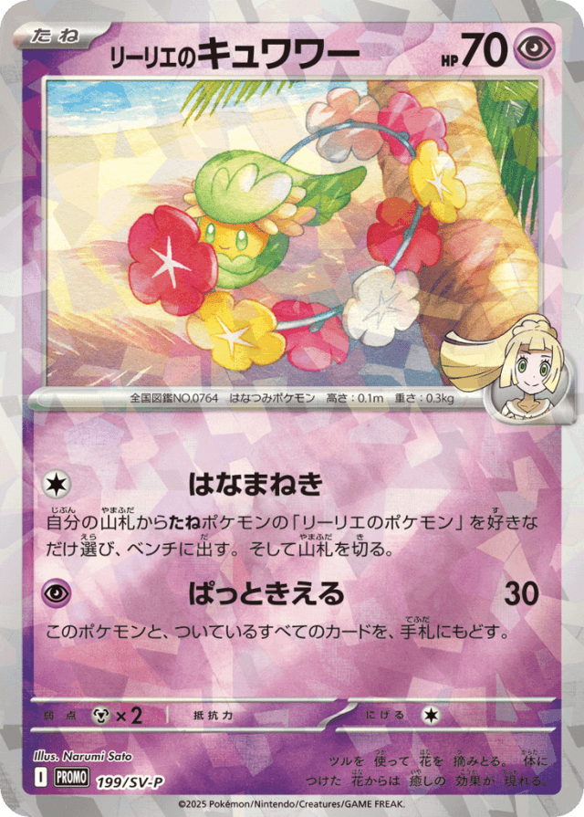 自分の山札からたねポケモンの「リーリエのポケモン」を好きなだけ選び、ベンチに出す。そして山札を切る。