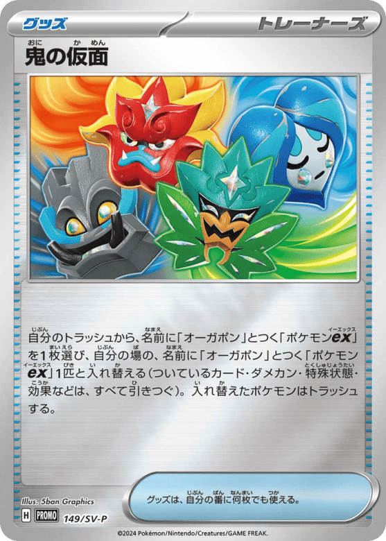 自分のトラッシュから、名前に「オーガポン」とつく「ポケモンex」を1枚選び、自分の場の、名前に「オーガポン」とつく「ポケモンex」1匹と入れ替える(ついているカード・ダメカン・特殊状態・効果などは、すべて引きつぐ)。入れ替えたポケモンはトラッシュする。 グッズは、自分の番に何枚でも使える。