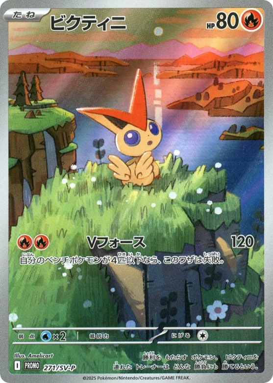勝利を もたらす ポケモン。 ビクティニを 連れた トレーナーは どんな 勝負にも 勝てるという。 (This Pokémon brings victory. It is said that Trainers with Victini always win, regardless of the type of encounter.)