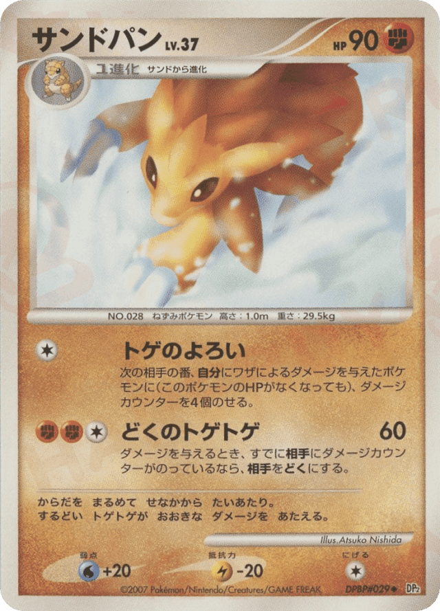 Sand AttackCost: 1次の相手の番、自分にワザによるダメージを与えたポケモンに(このポケモンのHPがなくなっても)、ダメージカウンターを4個のせる。