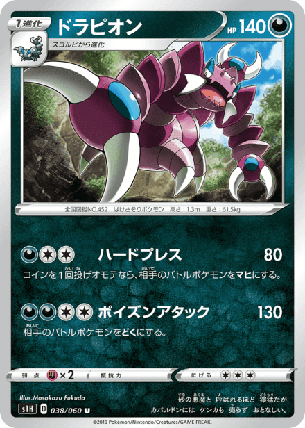 Shield (シールド) is the Japanese Sword & Shield expansion released on December 6, 2019, and is an early set in the Sword & Shield era of the Pokémon TCG. The set is catalogued with 75 total cards and 60 printed cards, released in Japanese under the code S1H. It sits among the launch-era Sword & Shield expansions and reflects the new-generation shakeup of the card pool at that time. Collectors typically find standard Pokémon, Trainer, and Energy cards in Japanese print, issued across the usual range of rarities for the series including holo and other special rarity prints common to Sword & Shield releases.