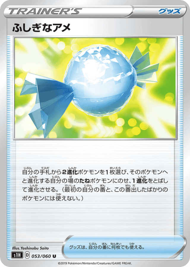 自分の手札から2進化ポケモンを1枚選び、そのポケモンへと進化する自分の場のたねポケモンにのせ、1進化をとばして進化させる。(最初の自分の番と、この番出したばかりのポケモンには使えない。) グッズは、自分の番に何枚でも使える。
