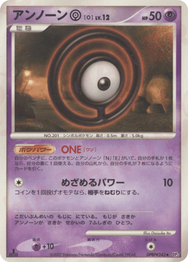 Once during your turn (before your attack), if you have Unown O, Unown N, and Unown E on your Bench and you have 1 card left in your hand, you may draw cards until you have 7 cards in your hand.