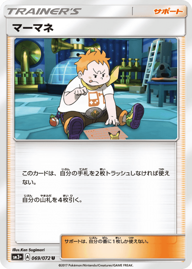 このカードは、自分の手札を2枚トラッシュしなければ使えない。 自分の山札を4枚引く。 サポートは、自分の番に1枚しか使えない。