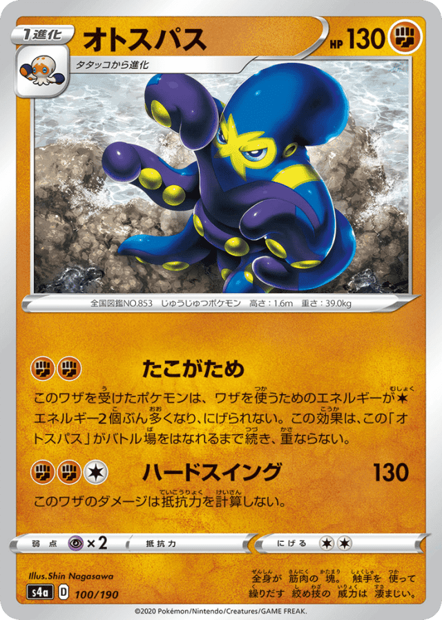 このワザを受けたポケモンは、ワザを使うためのエネルギーがColorlessエネルギー2個ぶん多くなり、にげられない。この効果は、この「オトスパス」がバトル場をはなれるまで続き、重ならない。