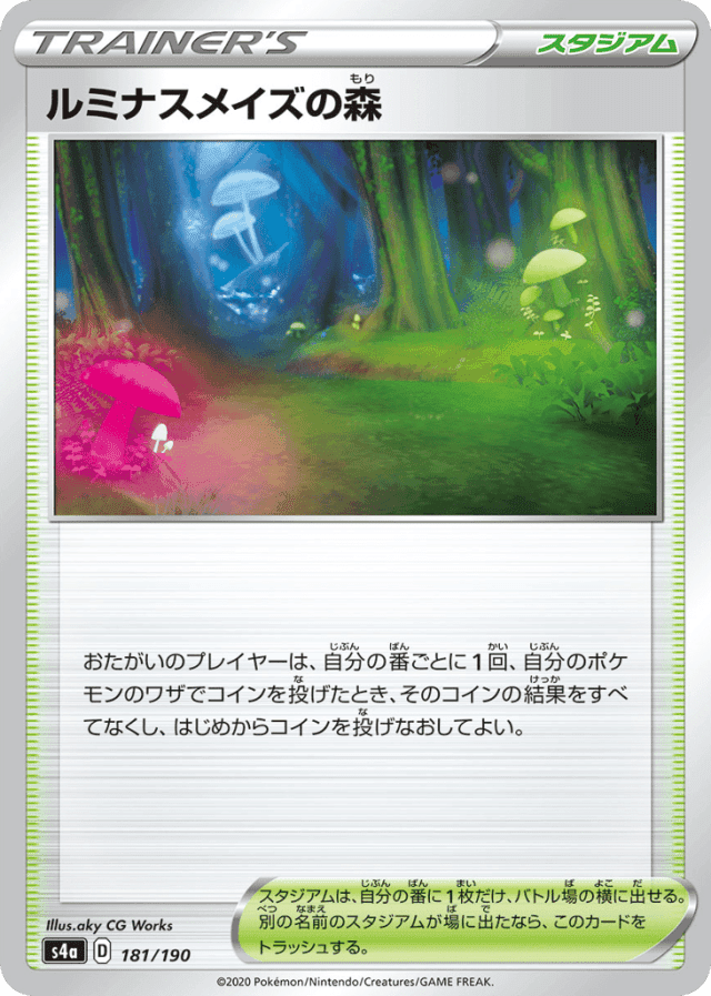 - おたがいのプレイヤーは、自分の番ごとに1回、自分のポケモンのワザでコインを投げたとき、そのコインの結果をすべてなくし、はじめからコインを投げなおしてよい。 — スタジアムは、自分の番に1枚だけ、バトル場の横に出せる。別の名前のスタジアムが場に出たなら、このカードをトラッシュする。