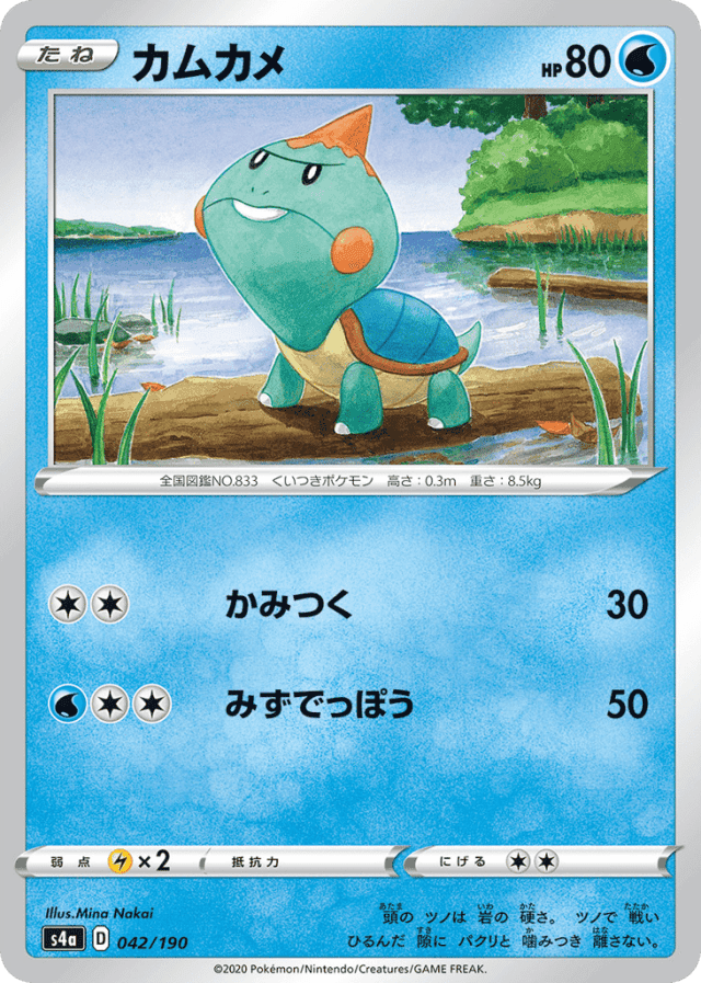頭の ツノは 岩の 硬さ。 ツノで 戦い ひるんだ 隙に パクリと 噛みつき 離さない。