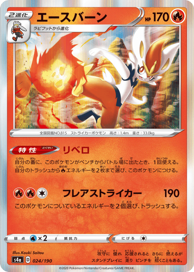 Libero自分の番に、このポケモンがベンチからバトル場に出たとき、1回使える。自分のトラッシュからFireエネルギーを2枚まで選び、このポケモンにつける。