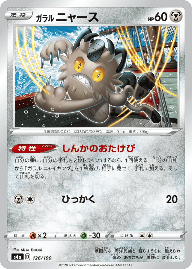 自分の番に、自分の手札を2枚トラッシュするなら、1回使える。自分の山札から「ガラル ニャイキング」を1枚選び、相手に見せて、手札に加える。そして山札を切る。