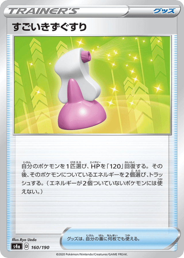 - 自分のポケモンを1匹選び、HPを「120」回復する。その後、そのポケモンについているエネルギーを2個選び、トラッシュする。(エネルギーが2個ついていないポケモンには使えない。) — グッズは、自分の番に何枚でも使える。
