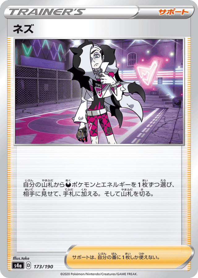 自分の山札からDarknessポケモンとエネルギーを1枚ずつ選び、相手に見せて、手札に加える。そして山札を切る。 サポートは、自分の番に1枚しか使えない。