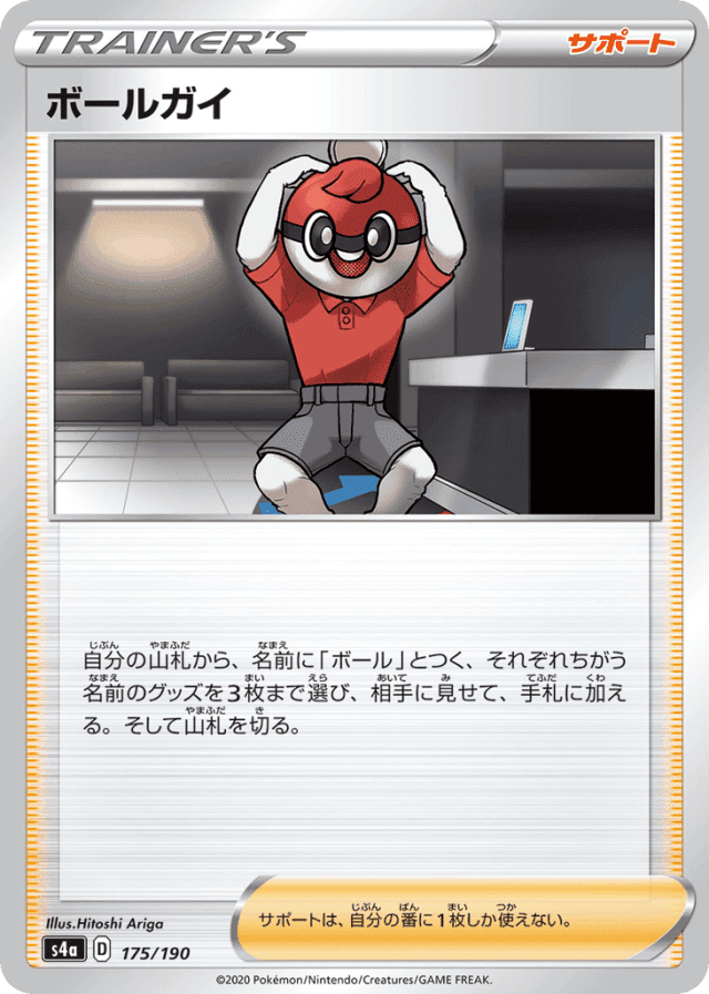 自分の山札から、名前に「ボール」とつく、それぞれちがう名前のグッズを3枚まで選び、相手に見せて、手札に加える。そして山札を切る。 サポートは、自分の番に1枚しか使えない。