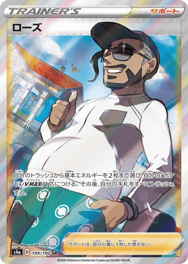自分のトラッシュから基本エネルギーを2枚まで選び、自分の「ポケモンVMAX」1匹につける。その後、自分の手札をすべてトラッシュする。 サポートは、自分の番に1枚しか使えない。