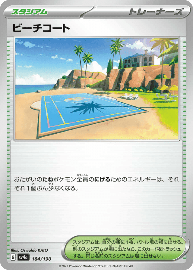 おたがいのたねポケモン全員のにげるためのエネルギーは、それぞれ1個ぶん少なくなる。 スタジアムは、自分の番に1枚だけ、バトル場の横に出せる。別の名前のスタジアムが場に出たなら、このカードをトラッシュする。