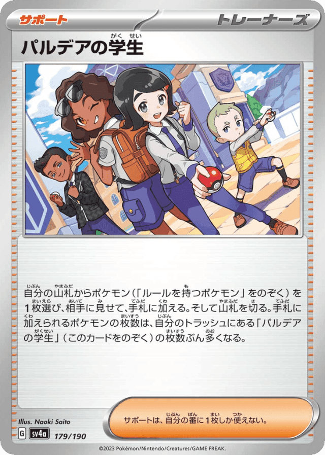 自分の山札からポケモン(「ルールを持つポケモン」をのぞく)を1枚選び、相手に見せて、手札に加える。そして山札を切る。手札に加えられるポケモンの枚数は、自分のトラッシュにある「パルデアの学生」(このカードをのぞく)の枚数ぶん多くなる。 サポートは、自分の番に1枚しか使えない。