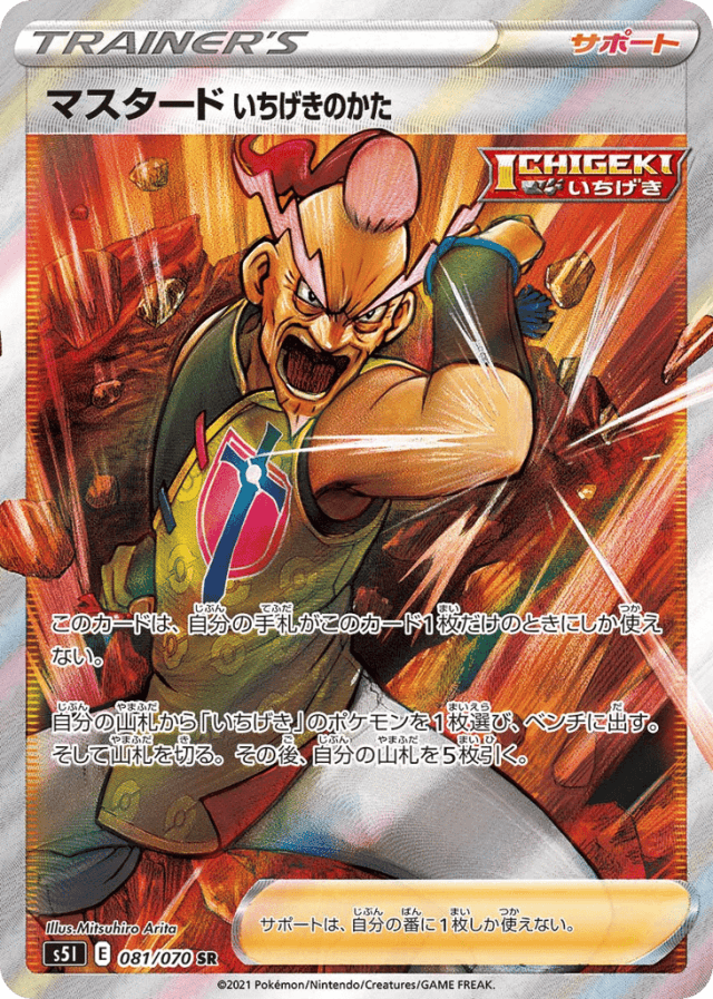 このカードは、自分の手札がこのカード1枚だけのときにしか使えない。 自分の山札から「いちげき」のポケモンを1枚選び、ベンチに出す。そして山札を切る。その後、自分の山札を5枚引く。 サポートは、自分の番に1枚しか使えない。