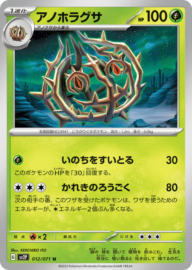 Withered Tree Prison80Cost: 3次の相手の番、このワザを受けたポケモンは、ワザを使うためのエネルギーが、Colorlessエネルギー2個ぶん多くなる。