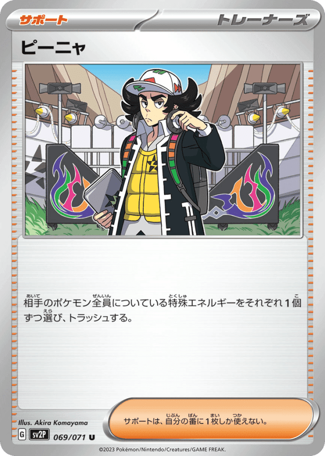 相手のポケモン全員についている特殊エネルギーをそれぞれ1個ずつ選び、トラッシュする。 サポートは、自分の番に1枚しか使えない。