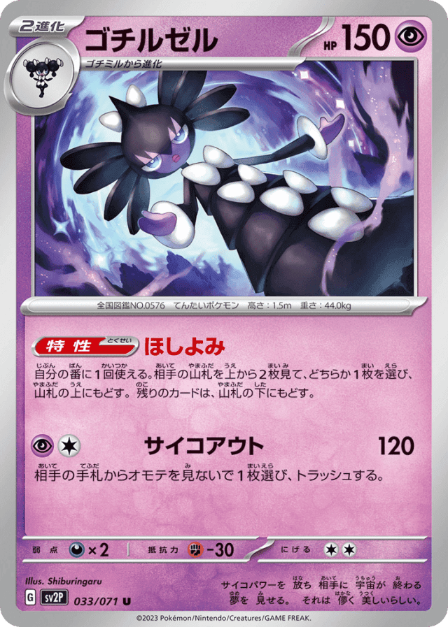 Star Reading自分の番に1回使える。相手の山札を上から2枚見て、どちらか1枚を選び、山札の上にもどす。残りのカードは、山札の下にもどす。