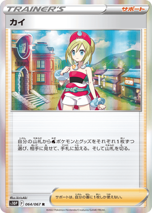 自分の山札からWaterポケモンとグッズをそれぞれ1枚ずつ選び、相手に見せて、手札に加える。そして山札を切る。 サポートは、自分の番に1枚しか使えない。