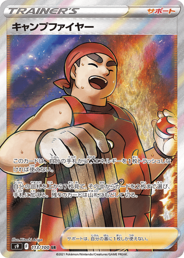 このカードは、自分の手札からFireエネルギーを1枚トラッシュしなければ使えない。 自分の山札を上から7枚見て、その中からカードを2枚まで選び、手札に加える。残りのカードは山札にもどして切る。 サポートは、自分の番に1枚しか使えない。