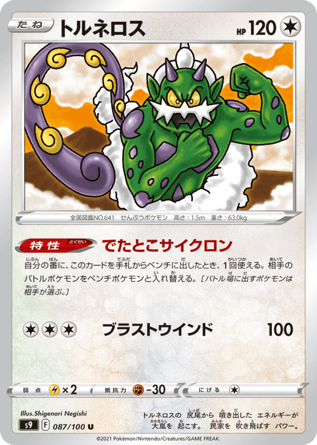 Sudden Cyclone自分の番に、このカードを手札からベンチに出したとき、1回使える。相手のバトルポケモンをベンチポケモンと入れ替える。[バトル場に出すポケモンは相手が選ぶ。]
