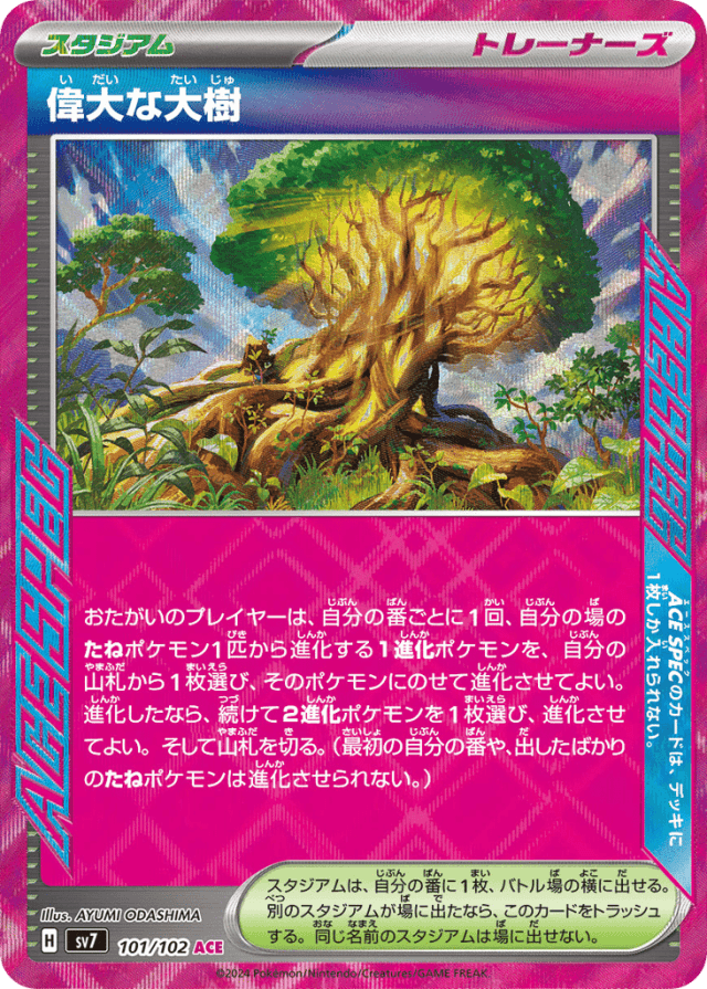 おたがいのプレイヤーは、自分の番ごとに1回、自分の場のたねポケモン1匹から進化する1進化ポケモンを、自分の山札から1枚選び、そのポケモンにのせて進化させてよい。進化したなら、続けて2進化ポケモンを1枚選び、進化させてよい。そして山札を切る。(最初の自分の番や、出したばかりのたねポケモンは進化させられない。) スタジアムは、自分の番に1枚だけ、バトル場の横に出せる。別の名前のスタジアムが場に出たなら、このカードをトラッシュする。