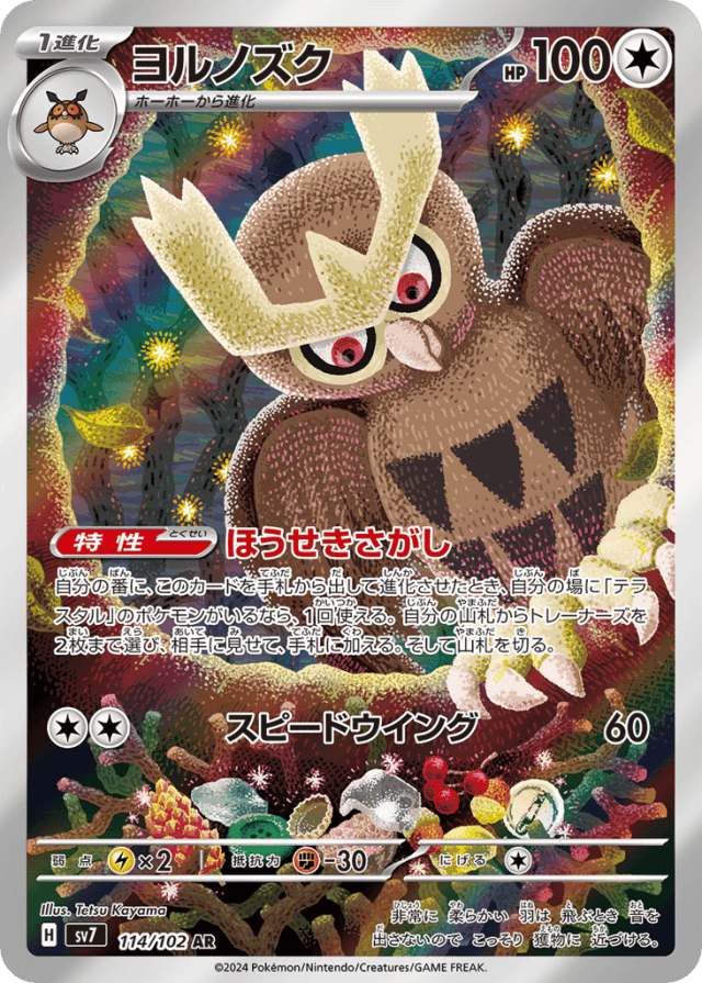 Jewel Seeker自分の番に、このカードを手札から出して進化させたとき、自分の場に「テラスタル」のポケモンがいるなら、1回使える。自分の山札からトレーナーズを2枚まで選び、相手に見せて、手札に加える。そして山札を切る。