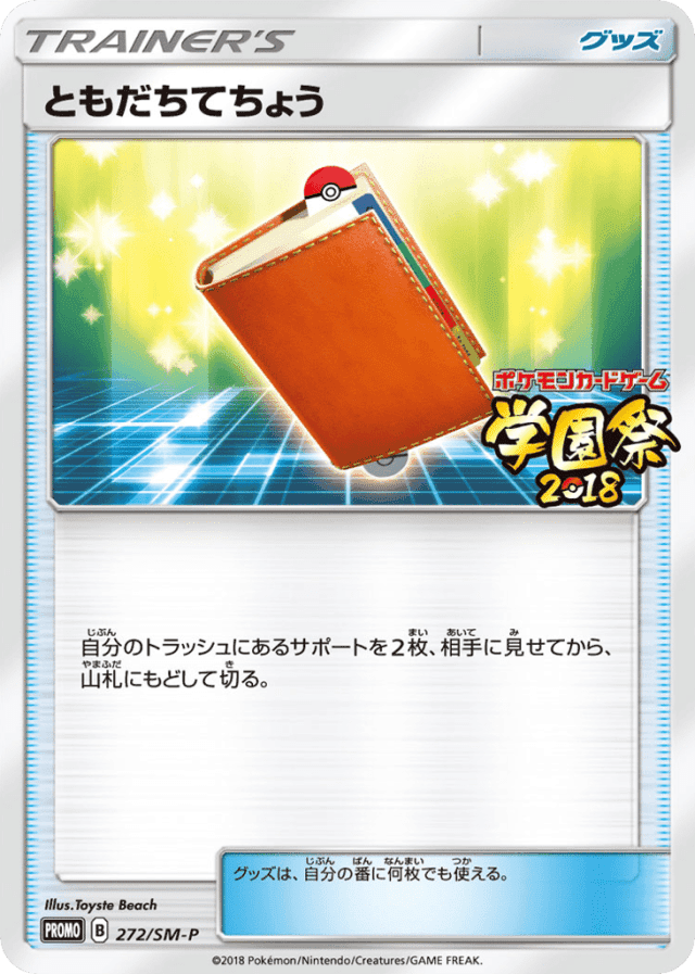 自分のトラッシュにあるサポートを2枚、相手に見せてから、山札にもどして切る。 グッズは、自分の番に何枚でも使える。