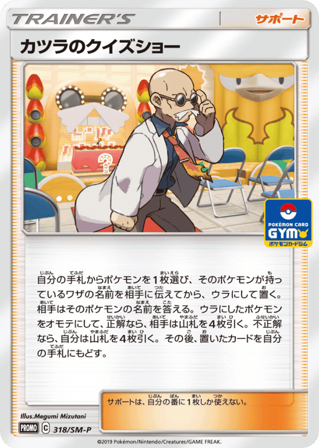 - 自分の手札からポケモンを1枚選び、そのポケモンが持っているワザの名前を相手に伝えてから、ウラにして置く。相手はそのポケモンの名前を答える。ウラにしたポケモンをオモテにして、正解なら、相手は山札を4枚引く。不正解なら、自分は山札を4枚引く。その後、置いたカードを自分の手札にもどす。 — サポートは、自分の番に1枚しか使えない。