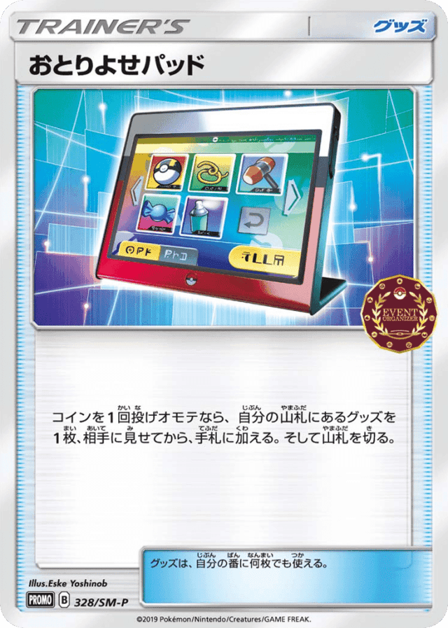 コインを1回投げオモテなら、自分の山札にあるグッズを1枚、相手に見せてから、手札に加える。そして山札を切る。 グッズは、自分の番に何枚でも使える。
