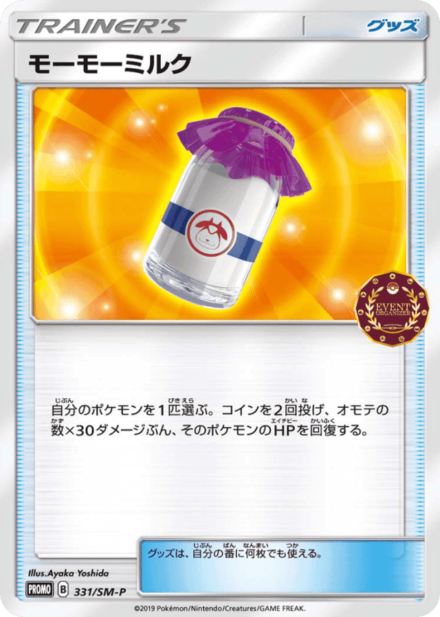 自分のポケモンを1匹選ぶ。コインを2回投げ、オモテの数×30ダメージぶん、そのポケモンのHPを回復する。 グッズは、自分の番に何枚でも使える。