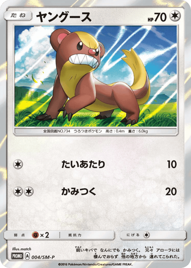 鋭いキバで なんにでも かみつく。 元々 アローラには 棲んでおらず 他の地方から 連れてこられた。