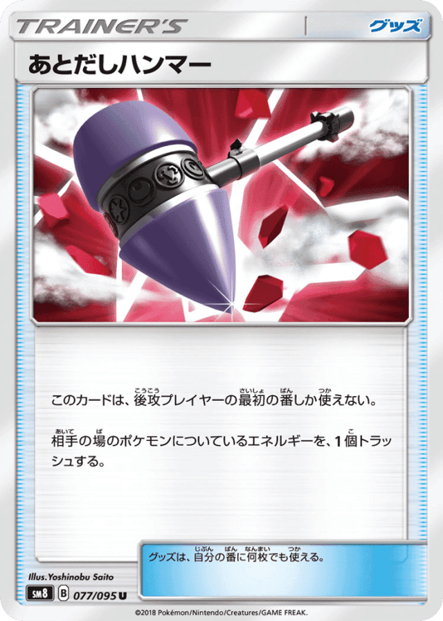 このカードは、後攻プレイヤーの最初の番しか使えない。 相手の場のポケモンについているエネルギーを、1個トラッシュする。 グッズは、自分の番に何枚でも使える。