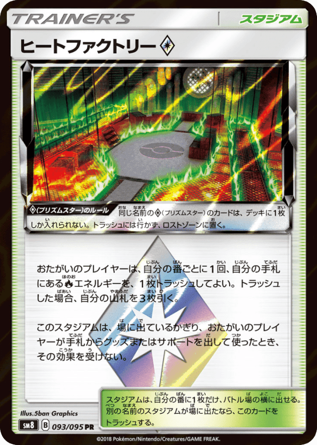 おたがいのプレイヤーは、自分の番ごとに1回、自分の手札にあるFireエネルギーを、1枚トラッシュしてよい。トラッシュした場合、自分の山札を3枚引く。 このスタジアムは、場に出ているかぎり、おたがいのプレイヤーが手札からグッズまたはサポートを出して使ったとき、その効果を受けない。 スタジアムは、自分の番に1枚だけ、バトル場の横に出せる。別の名前のスタジアムが場に出たなら、このカードをトラッシュする。