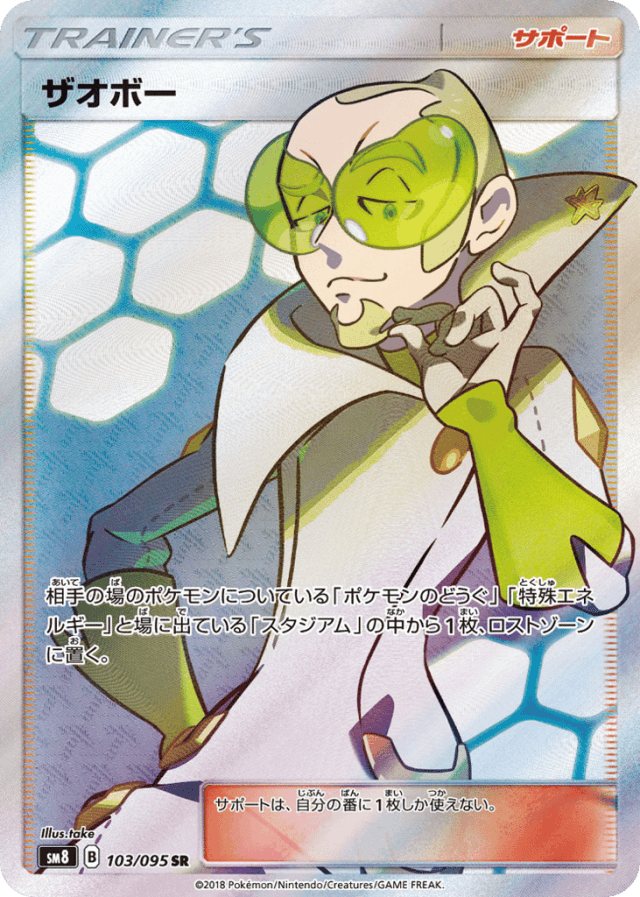 相手の場のポケモンについている「ポケモンのどうぐ」「特殊エネルギー」と場に出ている「スタジアム」の中から1枚、ロストゾーンに置く。 サポートは、自分の番に1枚しか使えない。