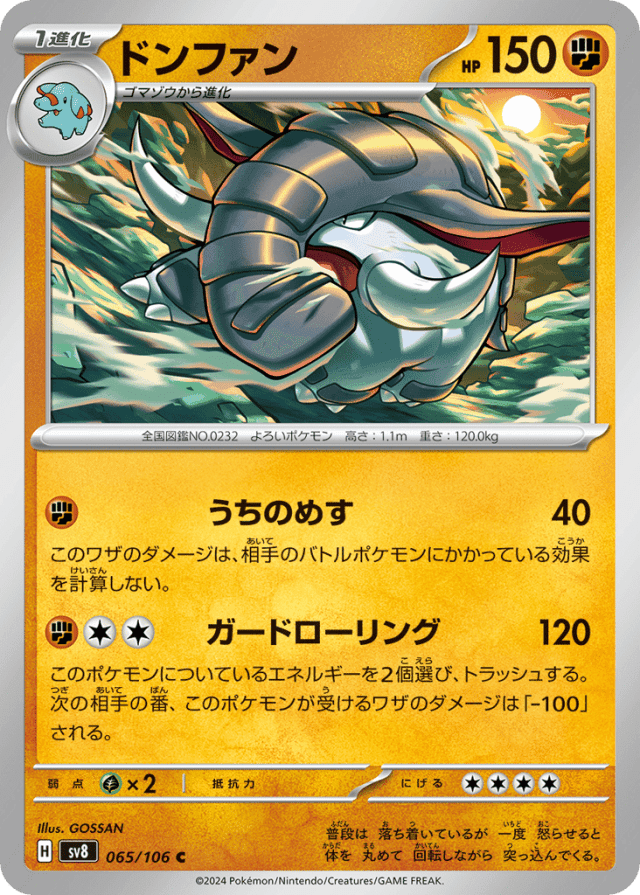 Guarded Rolling120Cost: 3このポケモンについているエネルギーを2個選び、トラッシュする。次の相手の番、このポケモンが受けるワザのダメージは「-100」される。