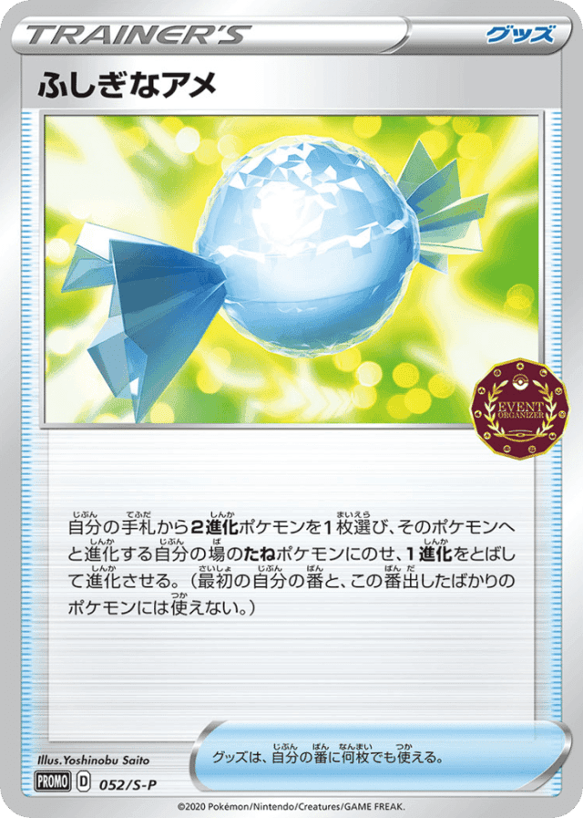 自分の手札から2進化ポケモンを1枚選び、そのポケモンへと進化する自分の場のたねポケモンにのせ、1進化をとばして進化させる。(最初の自分の番と、この番出したばかりのポケモンには使えない。) グッズは、自分の番に何枚でも使える。