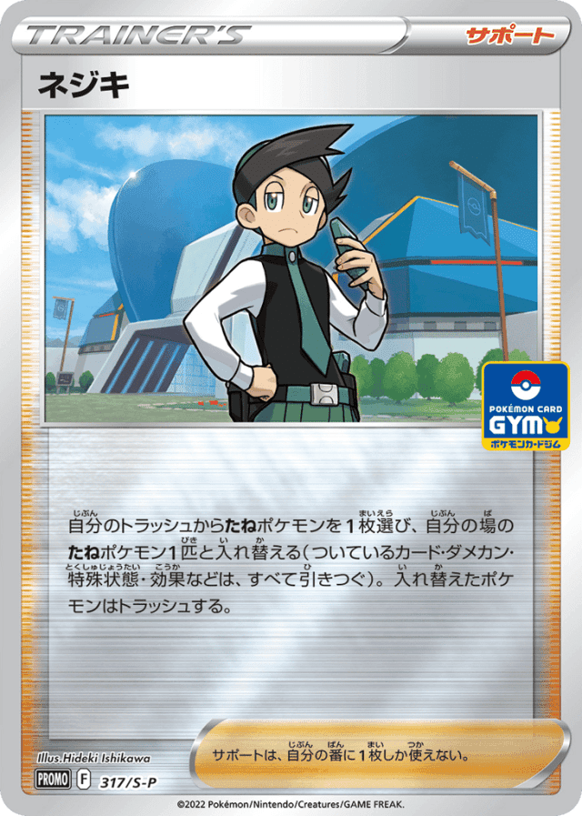 自分のトラッシュからたねポケモンを1枚選び、自分の場のたねポケモン1匹と入れ替える(ついているカード・ダメカン・特殊状態・効果などは、すべて引きつぐ)。入れ替えたポケモンはトラッシュする。 サポートは、自分の番に1枚しか使えない。