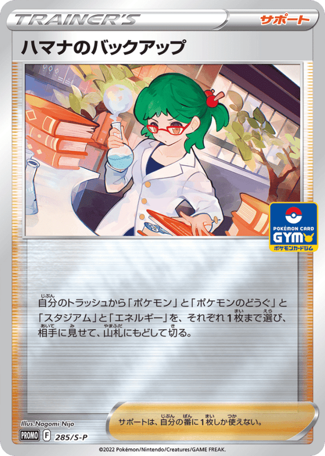 自分のトラッシュから「ポケモン」と「ポケモンのどうぐ」と「スタジアム」と「エネルギー」を、それぞれ1枚まで選び、相手に見せて、山札にもどして切る。 サポートは、自分の番に1枚しか使えない。