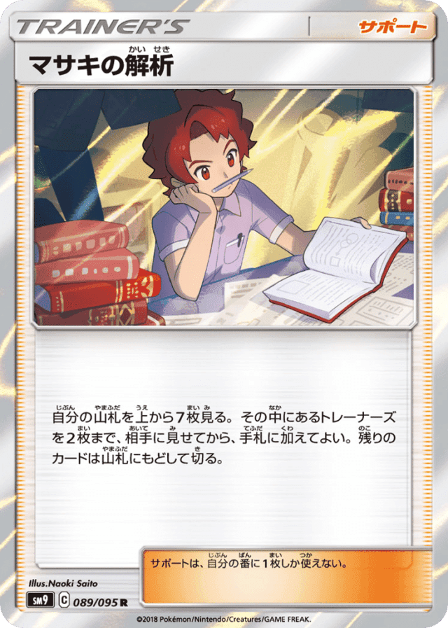 自分の山札を上から7枚見る。その中にあるトレーナーズを2枚まで、相手に見せてから、手札に加えてよい。残りのカードは山札にもどして切る。 サポートは、自分の番に1枚しか使えない。