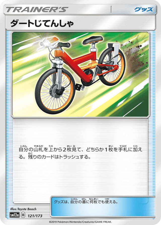 自分の山札を上から2枚見て、どちらか1枚を手札に加える。残りのカードはトラッシュする。 グッズは、自分の番に何枚でも使える。